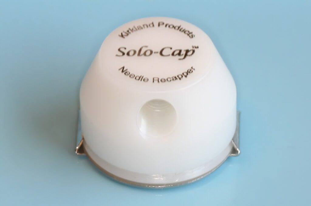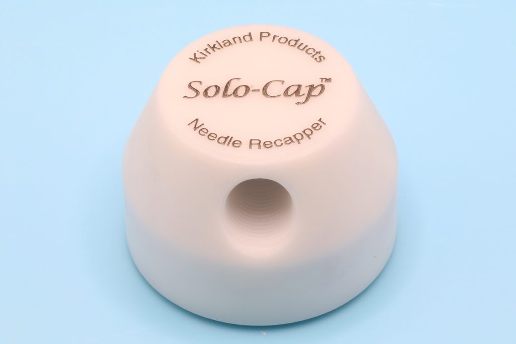 Solo-Cap™ Needle Recappers or Needle Recapping Devices are the latest addition to the Kirkland Products line. They were designed because of a specific need by Bill Kirkland, DDS while in dental school at UCLA. They allow one to safely unsheathe, hold the needle cover, and recap hypodermic needles single-handedly. This procedure is required by an OSHA ruling in order to minimize needle-stick injuries.